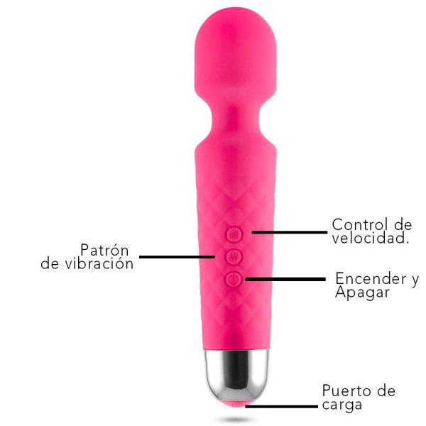 Masajeador personal de múltiples velocidades, cabeza flexible y funda para el juguete de penetración y estimulación clitoria. Love Magic Para empezar siga estos pasos para disfrutar de un masaje de lujo. El juguete viene de fábrica con 50% de carga Presione el botón de encendido para activar Presione el botón del medio para cambiar el patrón de vibración. Presione el botón de arriba para controlar la velocidad. Presione por unos segundos el botón de encendido para apagar. Cargar el Iwand: Cuando la vibración del juguete es débil o no enciende, pero la luz LED está encendida, por favor recargue la unidad. Inserte el puerto de carga en la unidad. Conecte el cable USB. El LED en la unidad se encenderá para indicar que está cargando. Cuando esté cargado del todo, después de dos horas, la luz se apagará. Beneficios de un masaje Veinte velocidades de vibración permiten aplicar disfrutar de varios niveles de intensidad en las áreas afectadas por tensión muscular, dolores o molestias. Masaje suave: Estimula la superficie de la piel y promueve la liberación de endorfinas, químicos naturales que hacen que el cuerpo se sienta relajado. El efecto de bienestar, disminuye el ritmo cardíaco y regula la respiración, reduciendo los niveles de estrés. El iWand Mini ofrece diez velocidades de vibración que premiten a los usuarios aplicar variados niveles de intensidad a áreas afectadas por incomodidad debido a la tensión muscular, dolores o incomodidad. El juguete, que es a prueba de agua, ofrece la opción de disfrutar de un masaje en la ducha. El agua tibia relaja los músculos y los hace más receptivos a la estimulación. Nota: El iWand Mini es un masajeador personal y no está clasificado como un dispositivo médico. No masajee sobre heridas abiertas o alrededor del pecho y la garganta. No use mientras el juguete está conectado y en modo de carga. Cuando vaya a recargar las baterías, por favor inserte cuidadosamente el plug con cuidado. Cuidados del juguete: Lave la silicona con agua tibia y jabón de juguetes o toy cleaner, enjuague con agua caliente y seque con una toalla. Nunca use productos con alcohol, petróleo o acetona. No deje su iWand en la luz directa del sol y nunca lo exponga a calor exremo. Guarde la unidad en un lugar libre de polvo. Características juguete Color: Rosado Largo total: 20 cms Diámetro: 4 cm Carga: Cable USB Material: Silicona + ABS y metal (en el interior) Peso: 185 gramos. Características empaque: Largo: 23 cm Ancho: 14 cm Profundo: 7 cm Peso total: 488 gr Confidencialidad: Tus pedidos se envían en una caja o sobre totalmente sellado opaco sin ningún tipo de marcas externas. Para nosotros es muy importante tu privacidad. Cuidado Y Limpieza: Jabón suave o limpiador de juguetes.